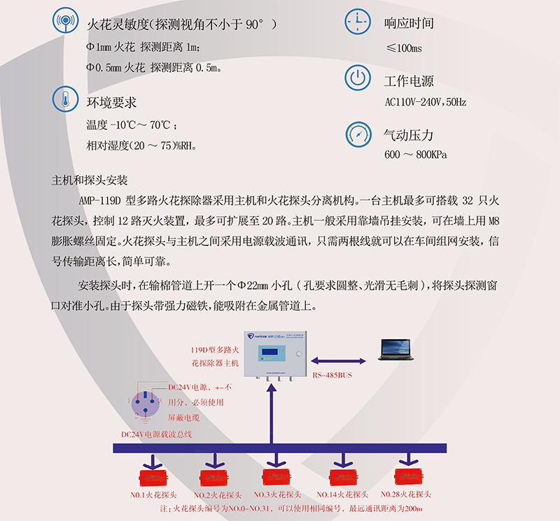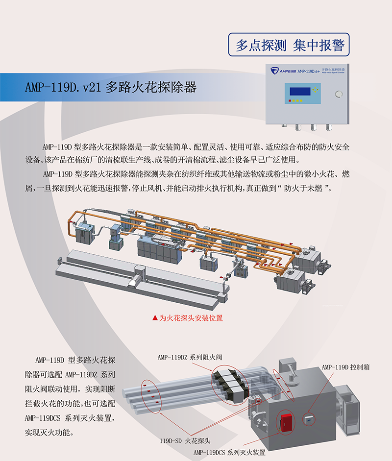 AMP-119D.e+多路火花探测器能探测夹杂在纺织纤维或其他输送物料或粉尘中的微小火花、燃屑,一旦探测到火花能迅速报警,停止风机、并能启动排火执行机构,真正做到“防火于未燃”,以确保生产安全。