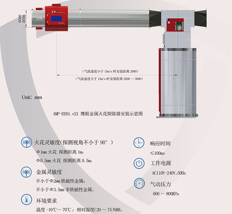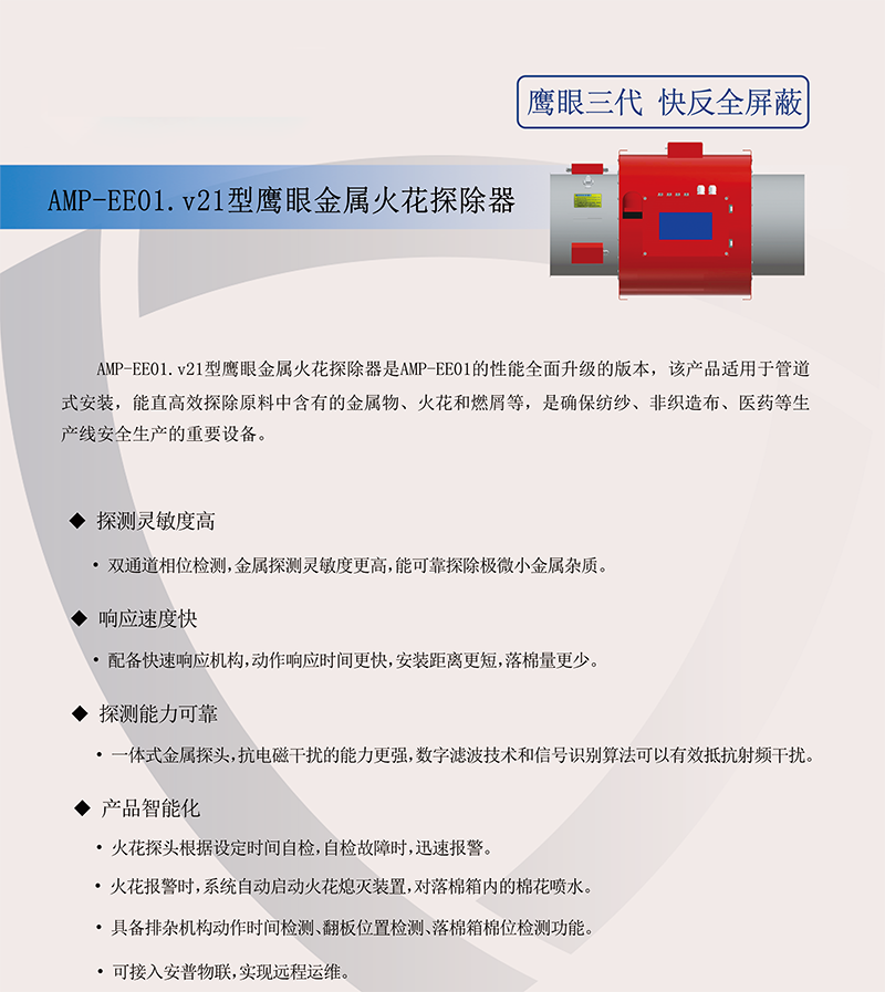 AMP-EE01.v21型鹰眼金属火花探除器具备探测高灵敏度,信号智能化识别,强抗干扰能力的全新的探测系统。该产品通常安装在依靠气流输送物料的系统中,对生产过程中混入或产生的金属及火花实现高效的探除。